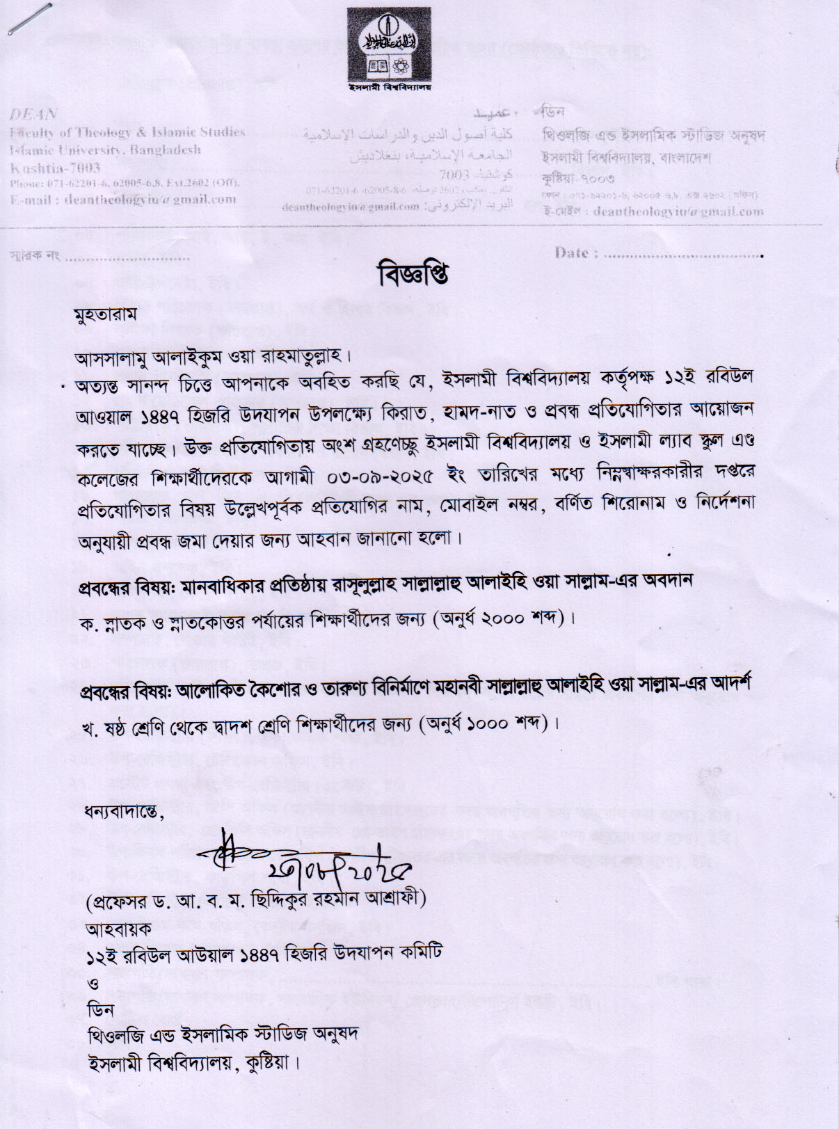 ইসলামী বিশ্ববিদ্যালয় কর্তৃপক্ষ ১২ই রবিউল আউয়াল ১৪৪৭ হিজরি উদযাপন উপলক্ষ্যে কিরাত, হামদ-নাত ও প্রবন্ধ প্রতিযোগিতা আয়োজন করতে যাচ্ছে। উক্ত প্রতিযোগিতায় অংশগ্রহণে আগ্রহী ইসলামী বিশ্ববিদ্যালয় এবং ইসলামী ল্যাব স্কুল এন্ড কলেজের শিক্ষার্থীদের আগামী ০৩ সেপ্টেম্বর ২০২৫ তারিখের মধ্যে প্রতিযোগিতার বিষয় উল্লেখ করে, প্রতিযোগীর নাম, মোবাইল নম্বর এবং প্রবন্ধ নিম্নস্বাক্ষরকারীর দপ্তরে জমা দিতে হবে।